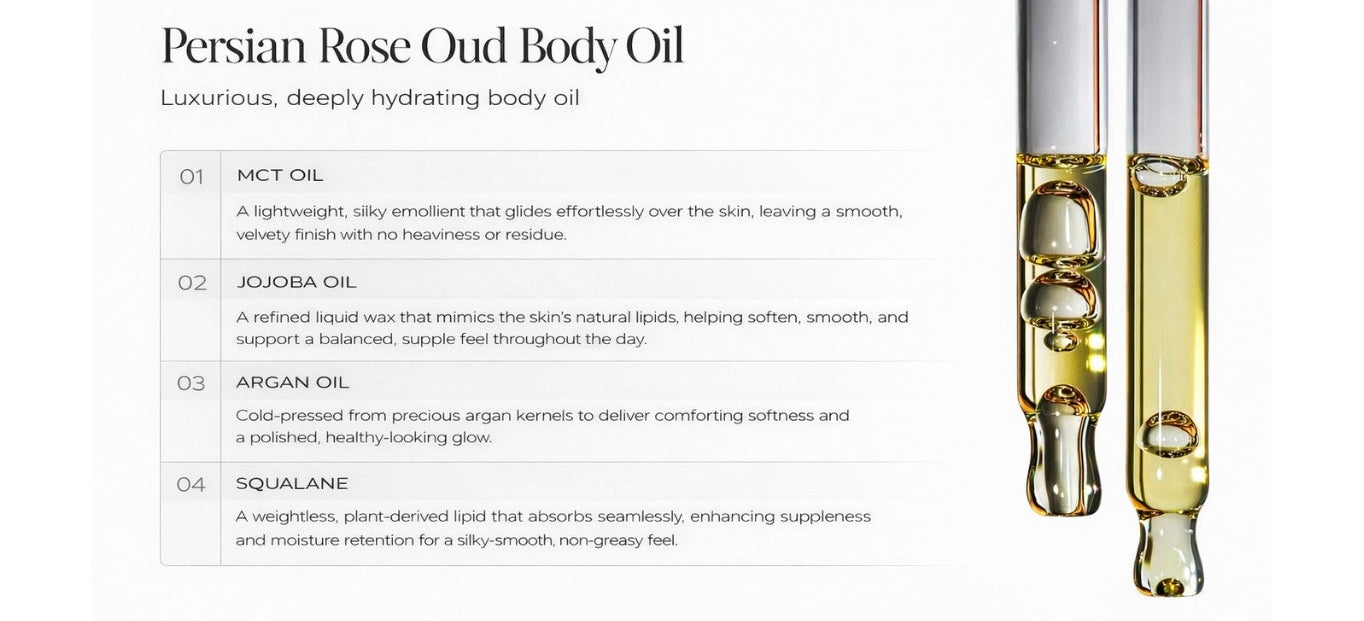 A lightweight, silky emollient that glides effortlessly across the skin, helping to create a smooth, velvety finish. It supports a soft and conditioned feel without heaviness or residue.